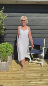 Denne lange hvide sommerkjole er indbegrebet af romantik og lethed. Fremstillet i 100% hør, føles den blød og åndbar mod huden – perfekt til varme sommerdage. De tynde stropper tilføjer et feminint og elegant touch, mens den løse pasform sikrer maksimal komfort.