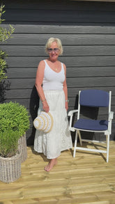 Feminin, elegant og tidløs – denne lange hvide nederdel i broderie anglaise er det perfekte valg til et sommerligt look. Fremstillet i 100% bomuld, er den både let, åndbar og behagelig at have på, uanset om du nyder en solrig dag i byen eller en afslappende stund ved stranden.