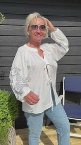 Tilføj et strejf af glamour til din garderobe med denne stilfulde skjorte i 100% bomuld, der kombinerer komfort med eksklusiv elegance. Det lette og åndbare bomuldsstof sikrer en behagelig pasform, mens de smukke sølv- og sortsten-detaljer skaber et raffineret og iøjnefaldende look.